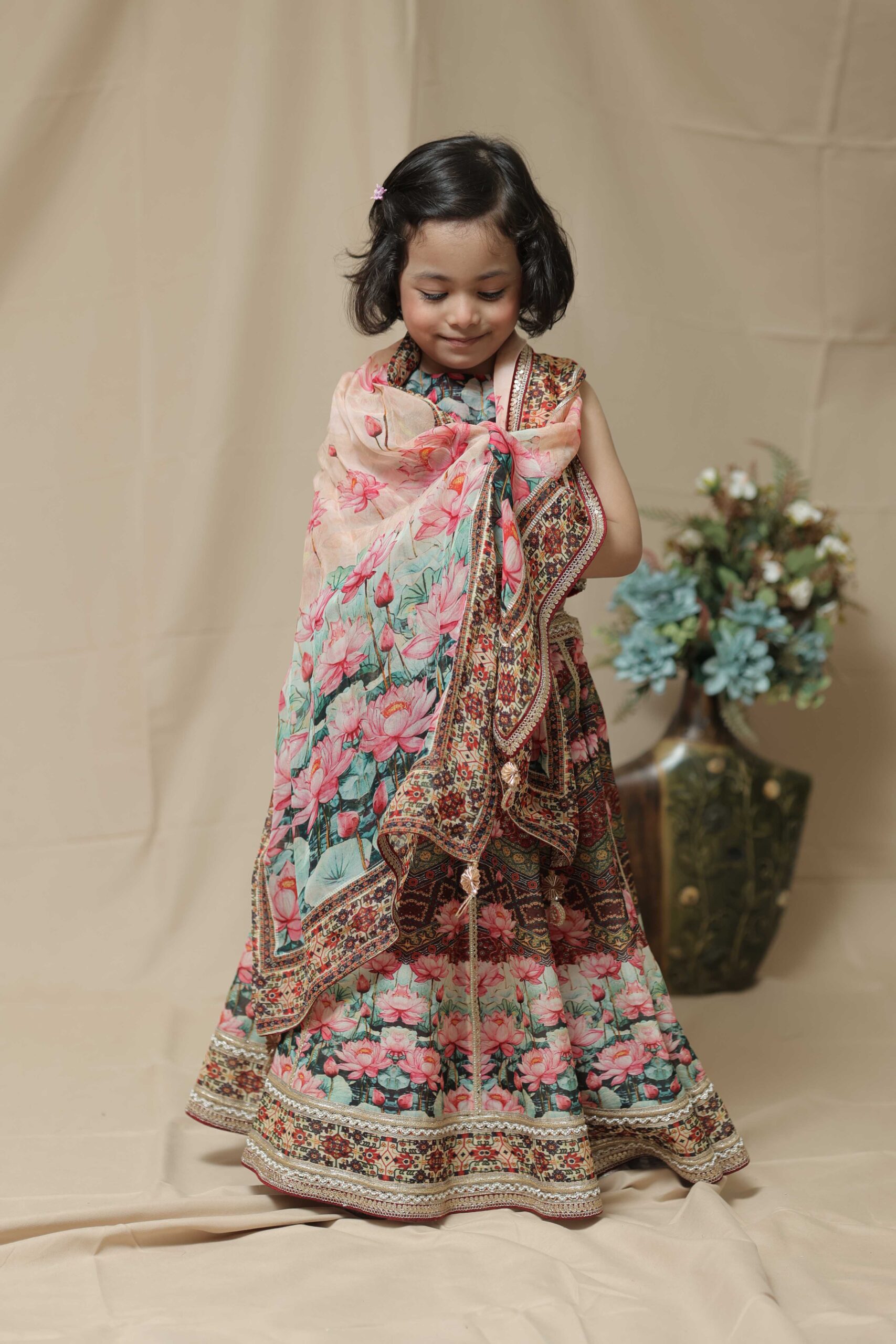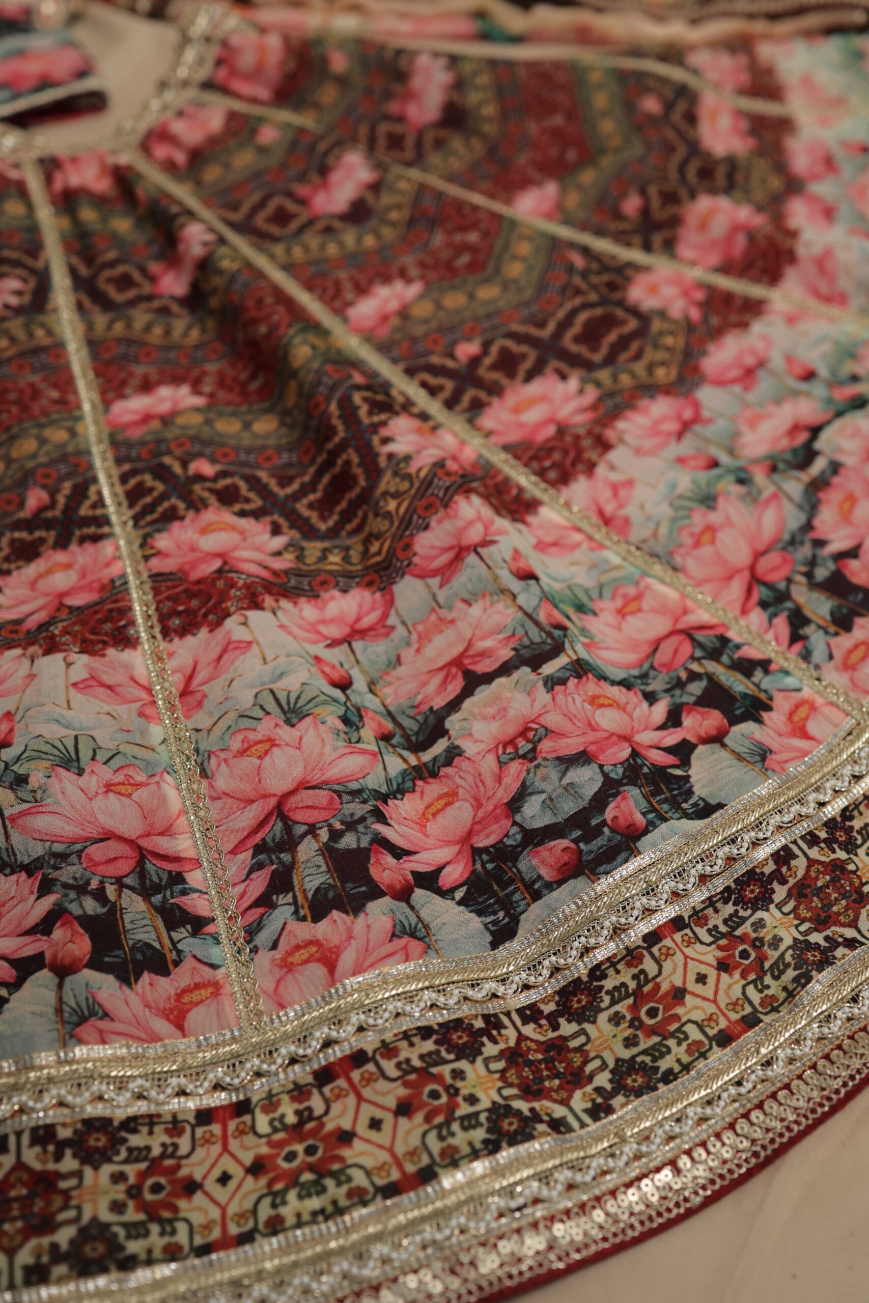Crafted in lightweight viscose organza, this set features digital prints brought to life with delicately embellished borders. The airy fabric and soft sheen offer effortless grace, while the detailed finish adds a touch of festive elegance. A versatile piece perfect for intimate celebrations and seasonal gatherings.