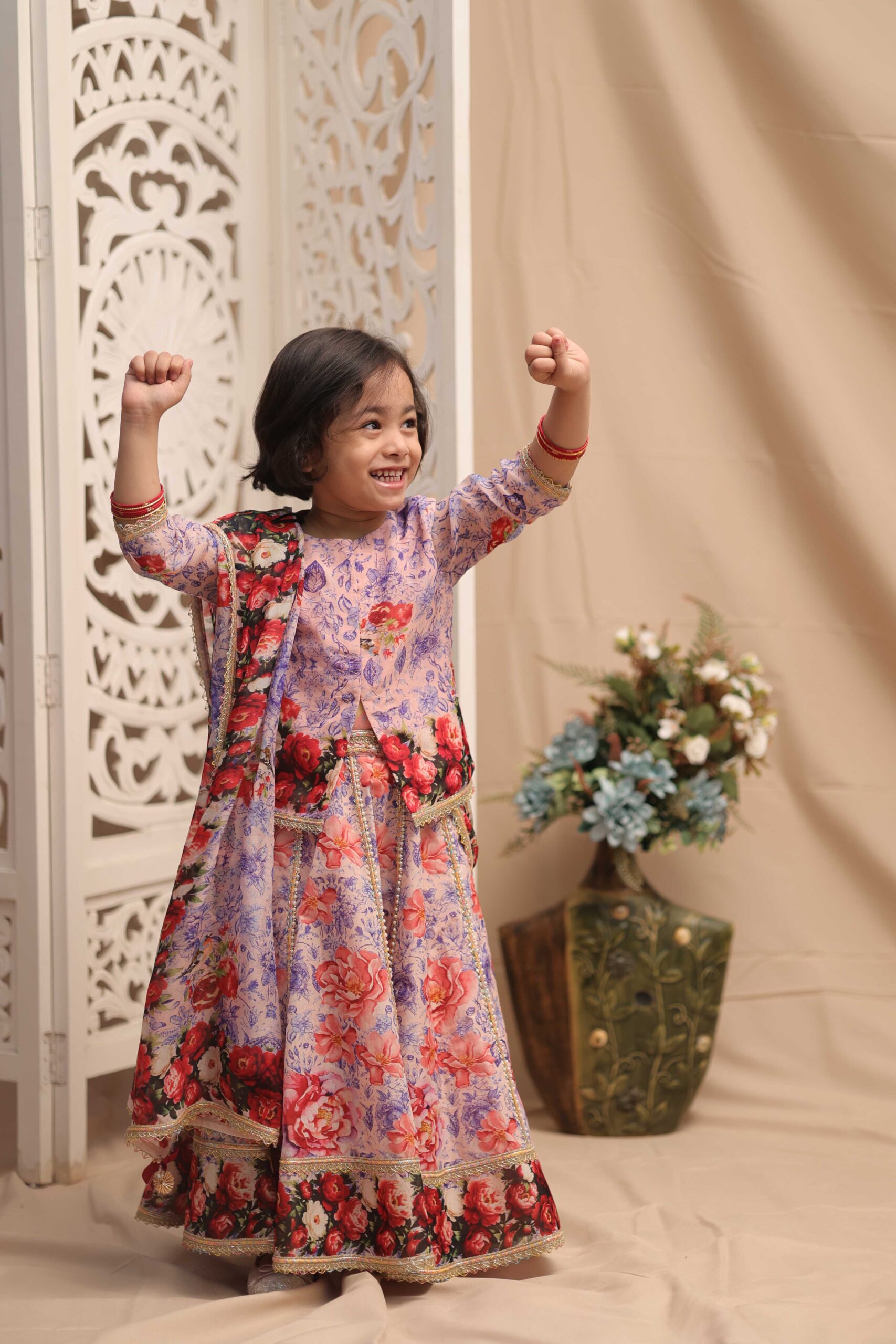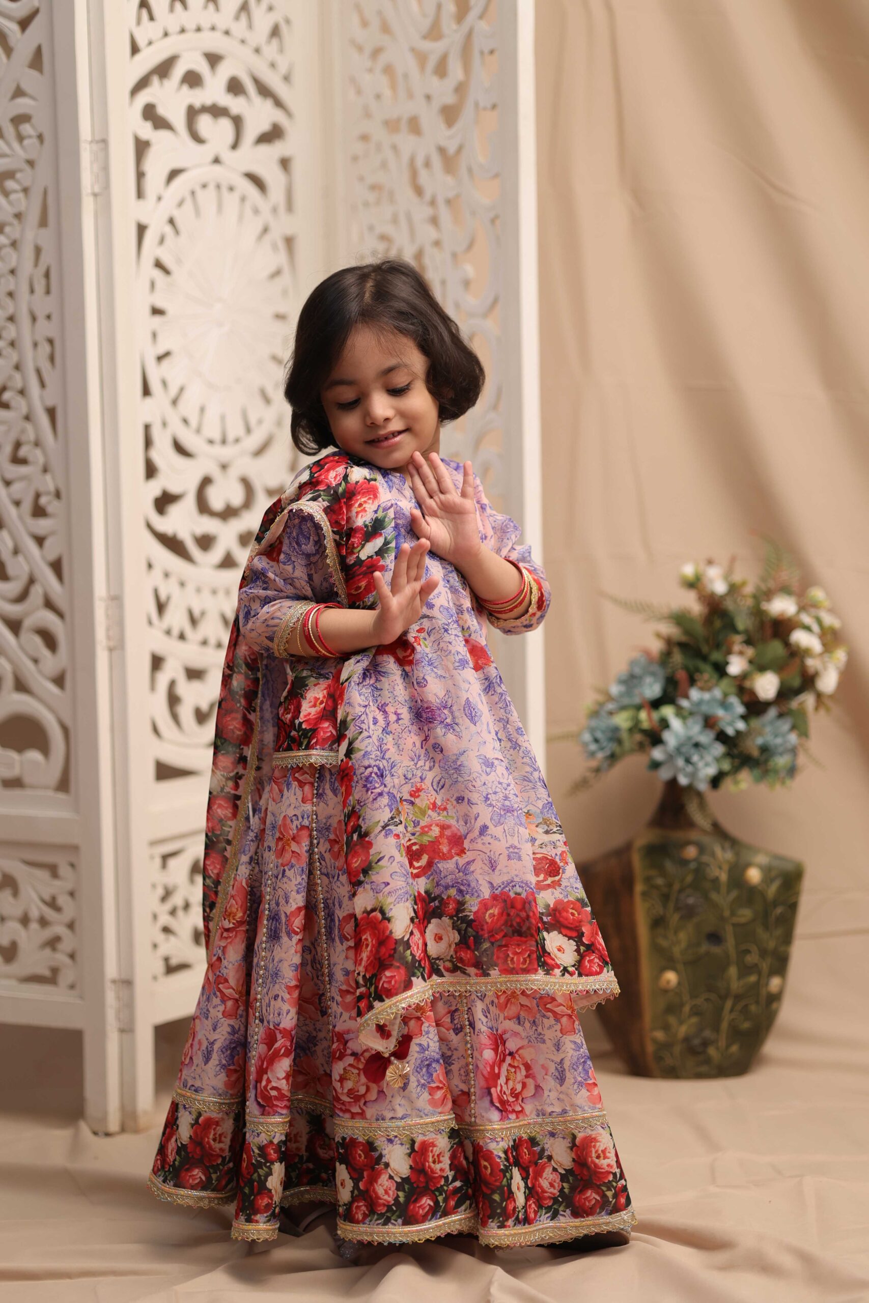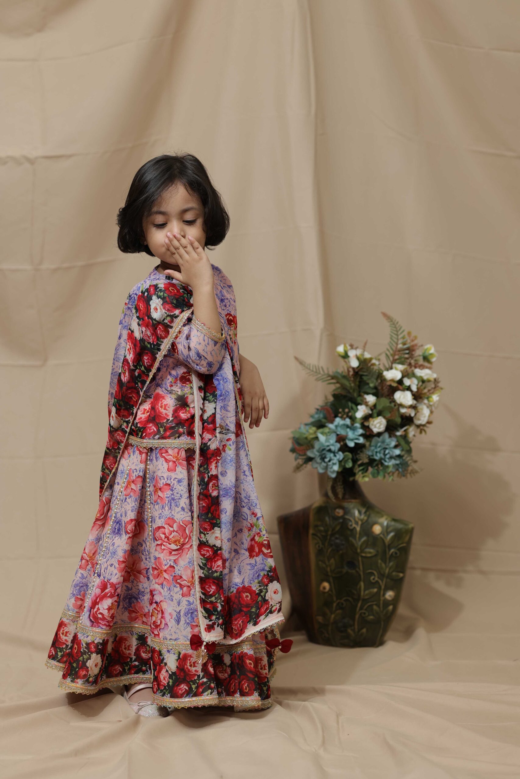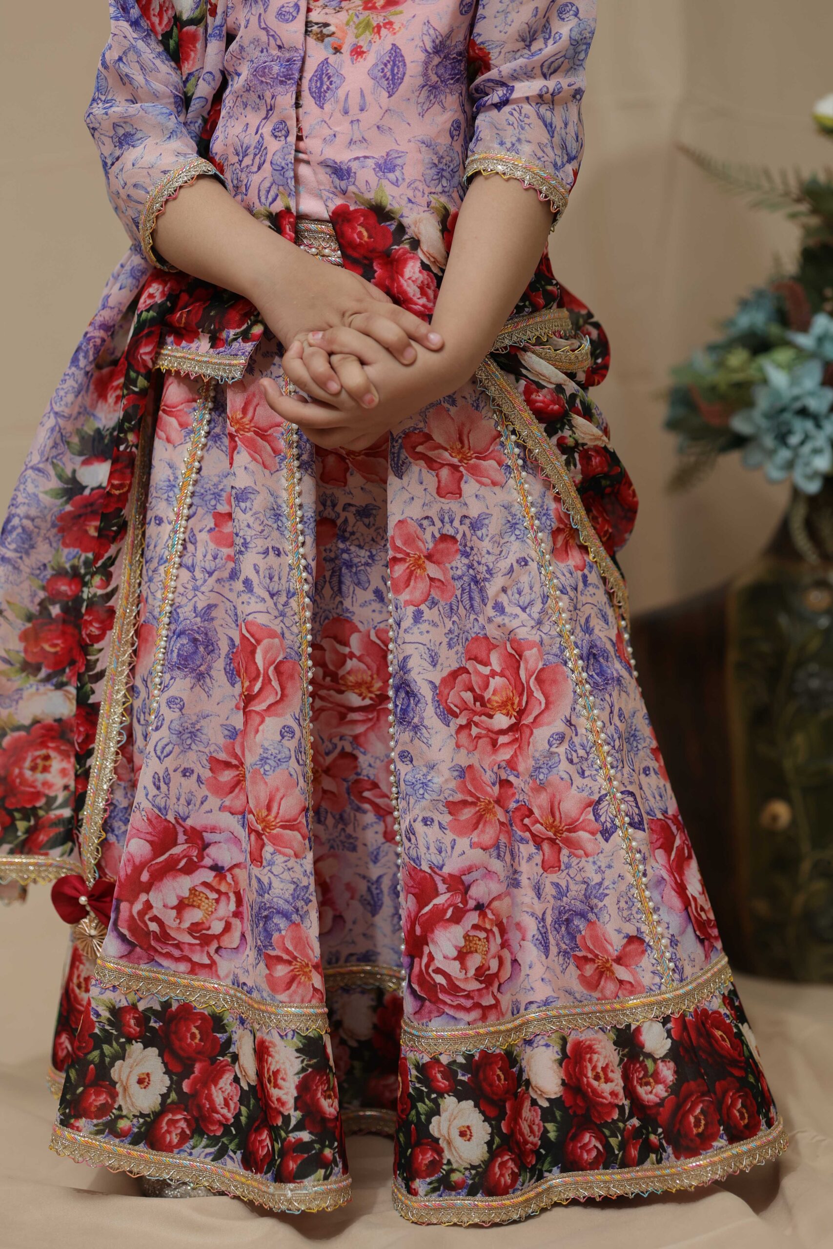 Showcasing a long choli paired with a flowing lehnga, crafted in luxurious viscose organza. The ensemble features a serene lotus-inspired digital print, accentuated with intricately embellished borders. A graceful fusion of tradition and modern aesthetics, this set is perfect for festive gatherings or intimate celebrations. Style it with statement earrings and soft waves for an ethereal, feminine look.